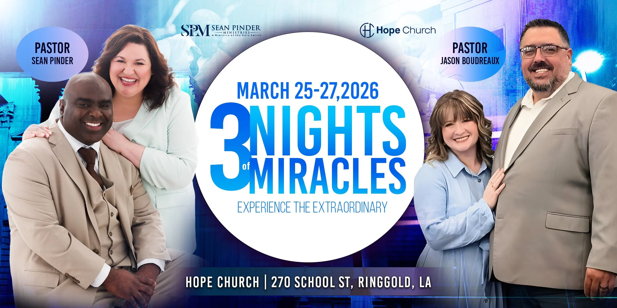 We have an exciting event coming up this March 25-27. We will be holding 3 Nights of Miracles at Hope Church in Ringgold, Louisiana.